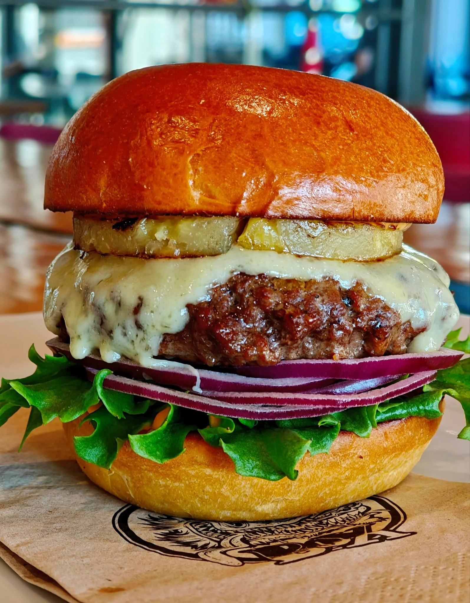Roslundin naudanjauhelihapihvi, cheddar, habaneromajoneesi, grillattu ananas, salaatti ja punasipuli